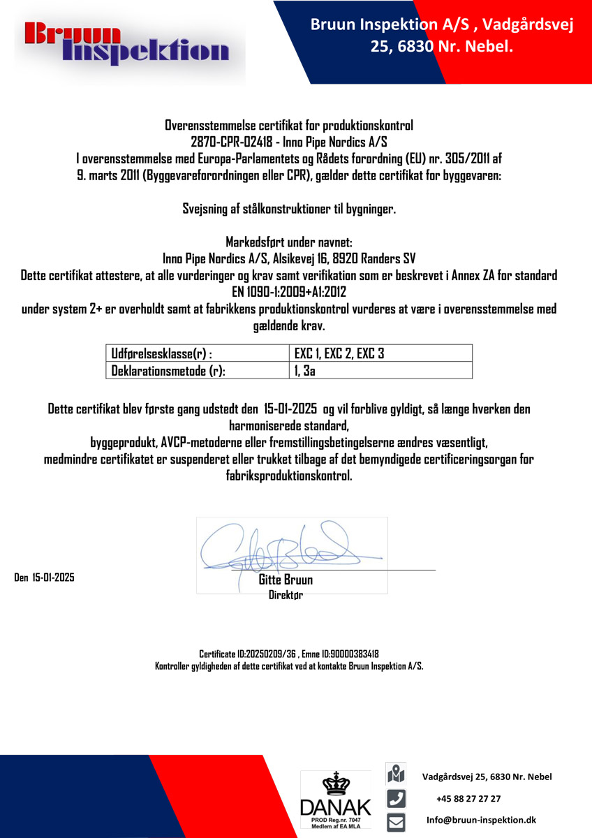 Inno Pipe Nordics has been certified according to DS/EN 1090-2 in 2022. This means that the company can comply with future requirements for CE marking.