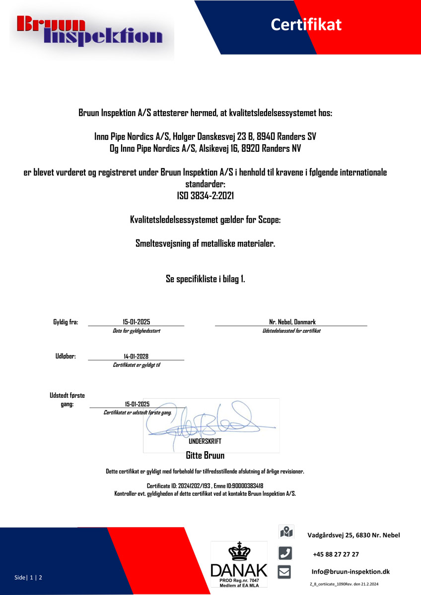 In connection with the approval for CE marking, Inno Pipe Nordics has had the welding workshop approved according to ISO 3834-2, where there are complete quality requirements.